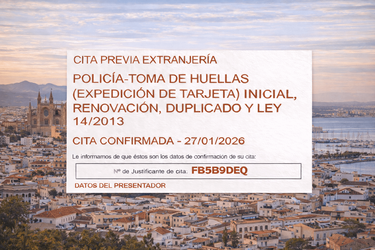 Our team specifically targets the appointment system for Mallorca, searching constantly to book the first slot that matches your schedule.